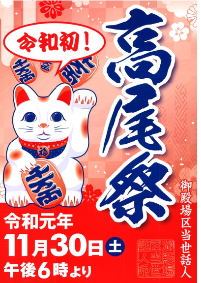 高尾祭に出店します♪ Posted on 2019年11月27日11月30日(土)18:00~ 高尾祭に出店します! 高尾祭とは… 徳川時代初期、甲府の高尾山より分霊された神社で豊作と商工業の繁栄、家内安全、開運、福運などを祈念するお祭り。千両箱や宝船などの縁起物がさげられた「お宝」を買い求める人たち。その威勢のいい手締めがあちこちからあがる。境内は朝までにぎわう。是非遊びにきてくださいね♪